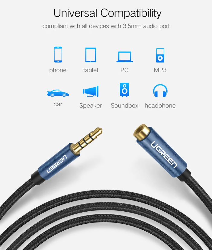 Extensión de cable de audio jack 3.5 mm de 1 metro, cable blindado con conectores chapados en oro. Compatible con audífonos, celulares, computadores, mixers y consolas.